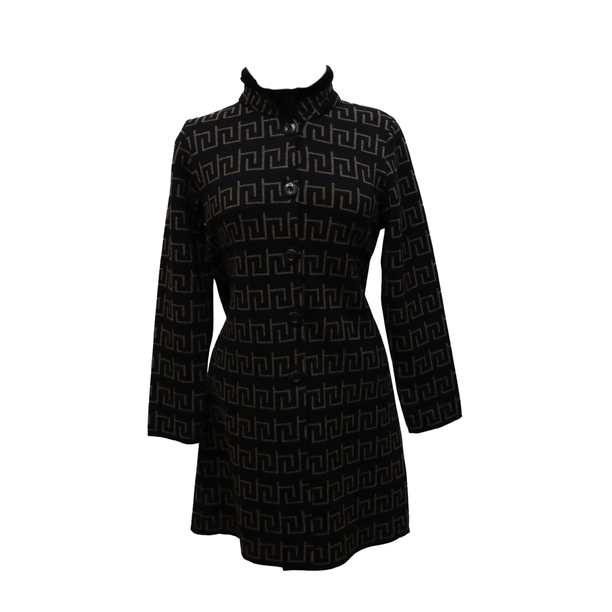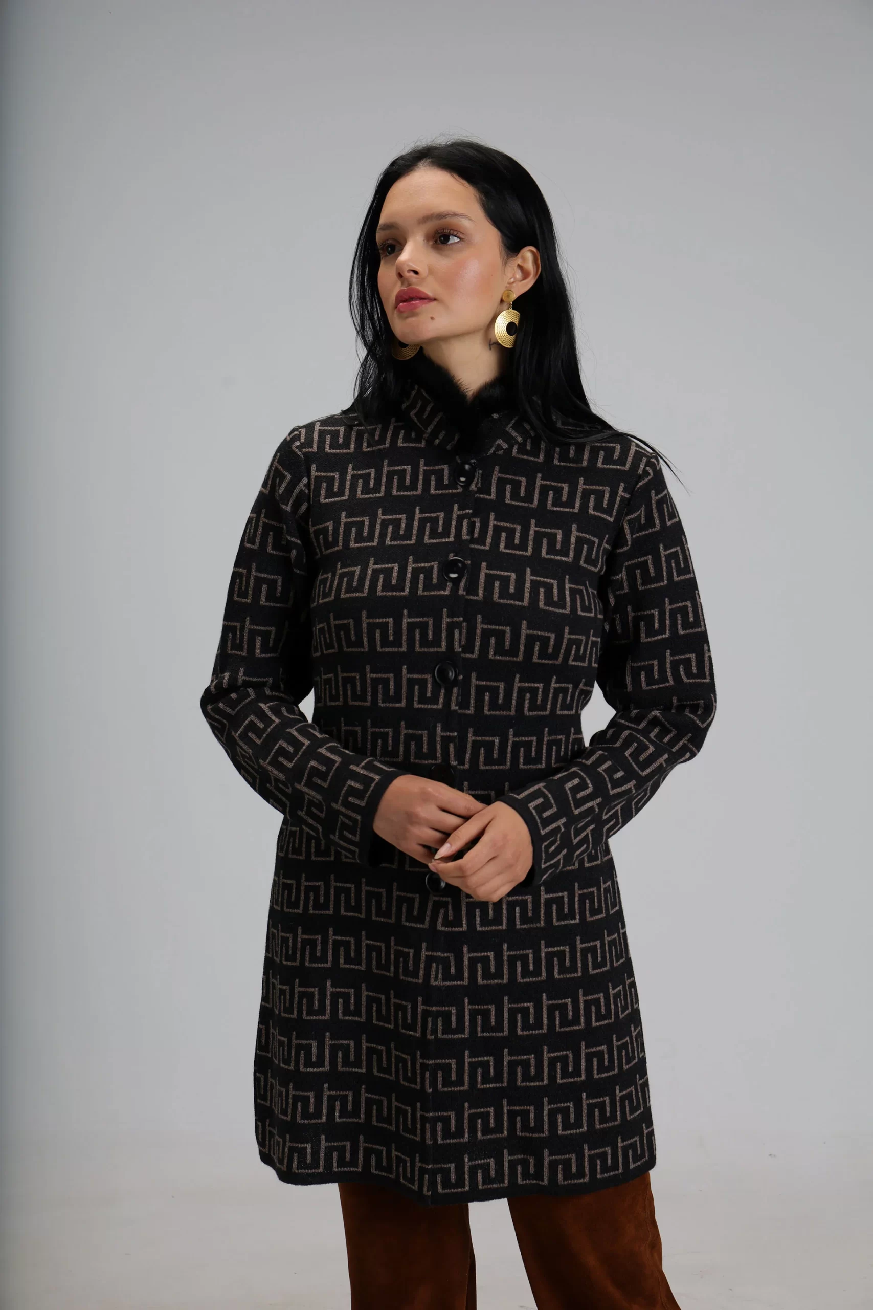 El filo de su cuello, en piel natural de conejo, aporta una nota de distinción y confort, mientras que el motivo simbólico del infinito, presente a lo largo de toda la prenda, evoca continuidad y equilibrio.
