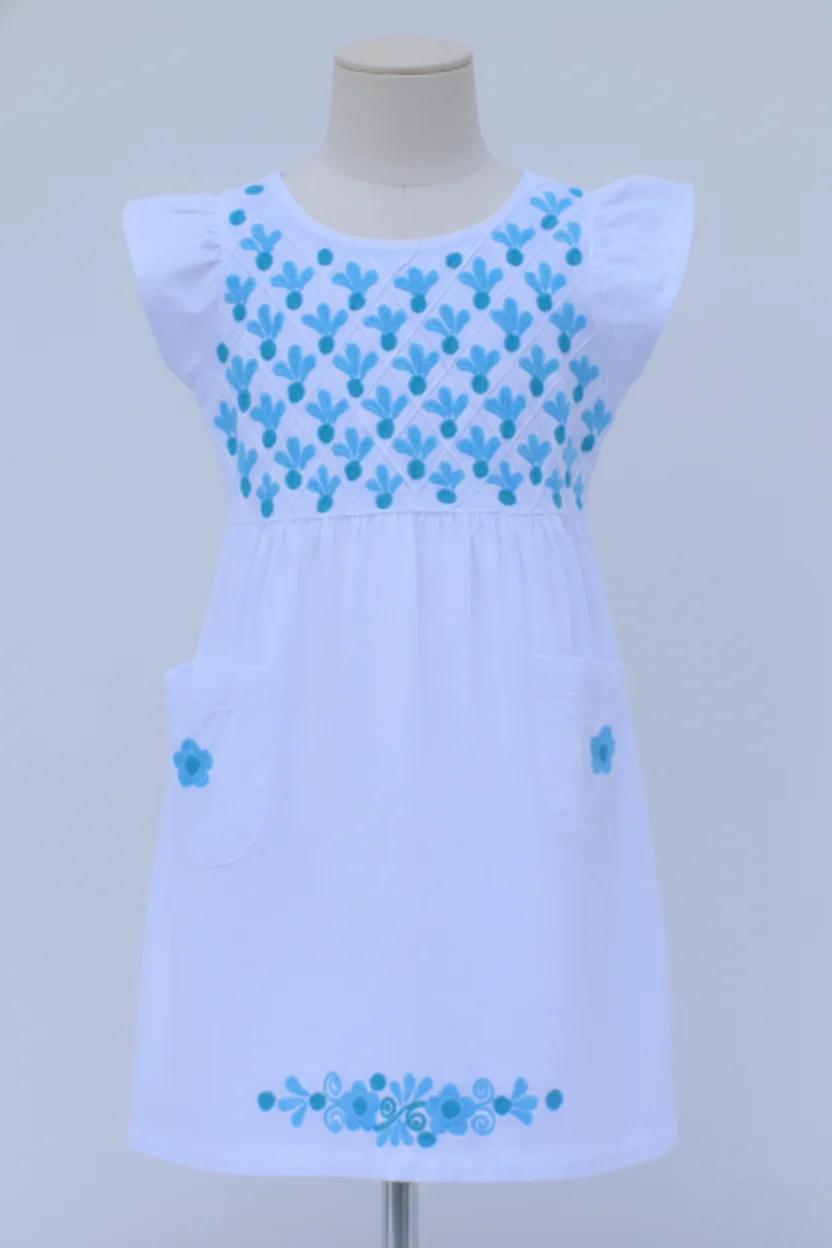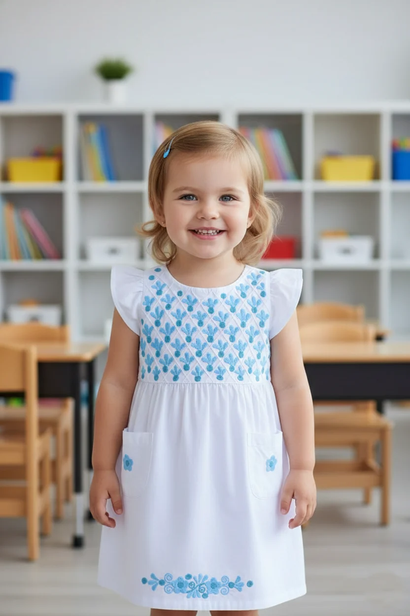 Este encantador vestido infantil es la pieza ideal para cualquier ocasión especial bajo el sol. Confeccionado en un suave tejido de algodón, destaca por su exquisito bordado floral, que aporta una textura artesanal y única.